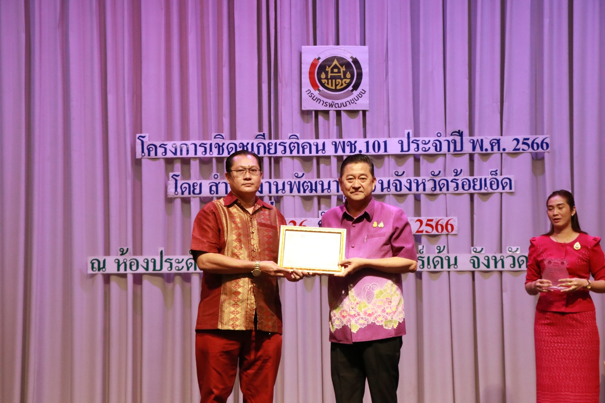 ได้มอบหมายให้นายนรินทร์ ทิพยศักดิ์ รองปลัดอบต. กับ นายยุทธจักร ชำนาญเอื้อ นักพัฒนาชุมชน เป็นตัวแทนในการเข้ารับร่วมโครงการเชิดชูเกียรติคน พช.101 ประจำปี 2566 ประชาสัมพันธ์ส่งเสริมการใช้และสวมผ้าไทย และรับมอบประกาศเกียรติคุณ โดยสำนักงานพัฒนาชุมชนจังหวัดร้อยเอ็ด